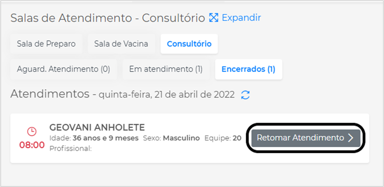 Encerrados: serão listados os pacientes com atendimentos finalizados no dia. Caso precise retornar ao atendimento que já foi finalizado, clique em Retomar Atendimento: