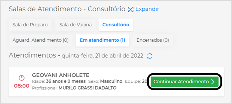 Em Atendimento: serão listados os pacientes que já tiveram o atendimento iniciado, mas não foi encerrado. Clique em Continuar Atendimento para dar continuidade a um atendimento existente: