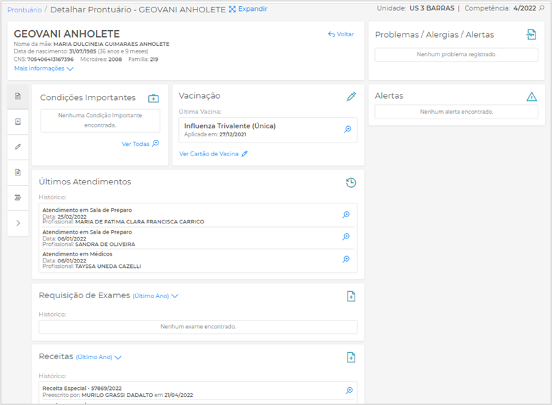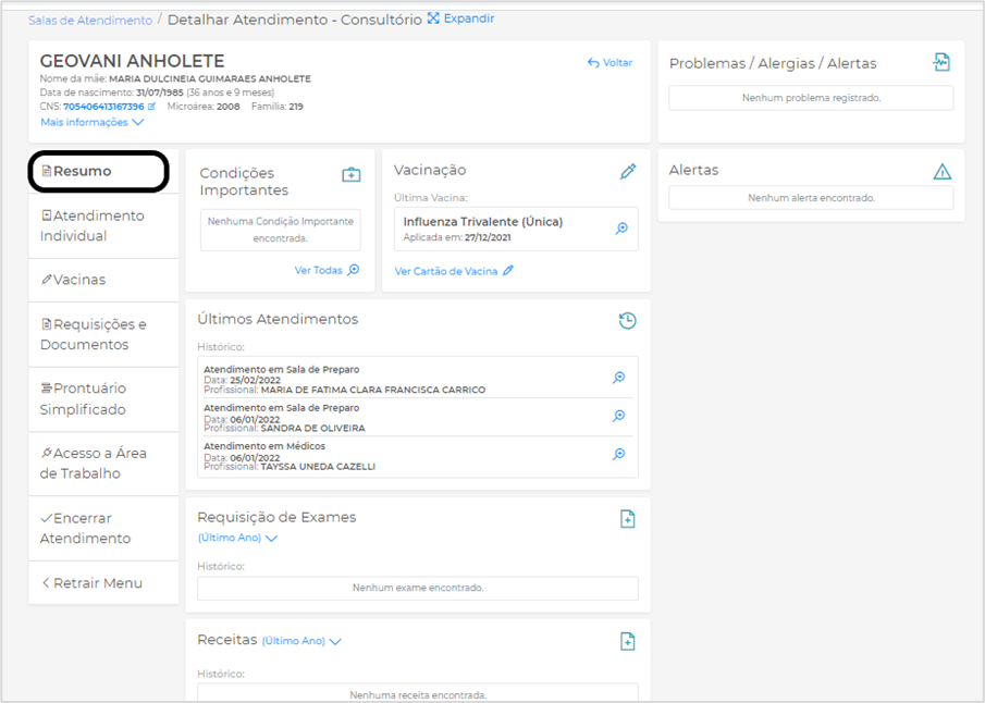 Problemas/Alergias/Alerta: Exibe informações caso o paciente tenha alguma alergia, por exemplo a determinado medicamento;