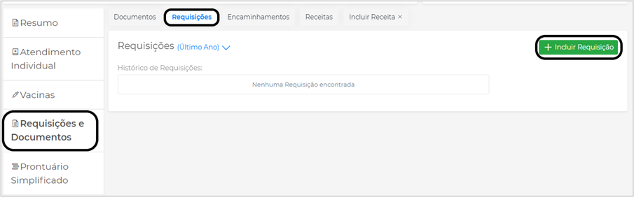 Em Requisições é onde será feito as requisições de Exames. Na aba Requisições Clique em Incluir Requisição: