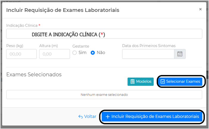 Para incluir um exame laboratorial, informe a indicação clínica e selecione os exames desejados: