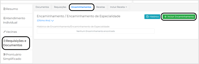 Permite ao profissional realizar encaminhamentos de paciente. Para incluir um novo encaminhamento, na aba Encaminhamentos clique em Incluir Encaminhamento: