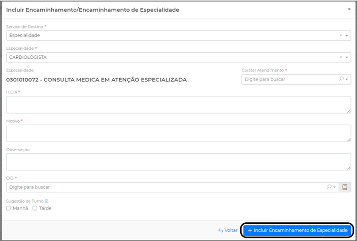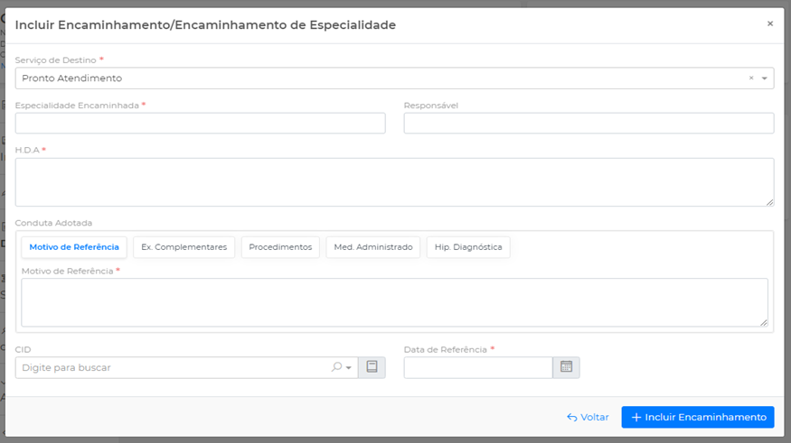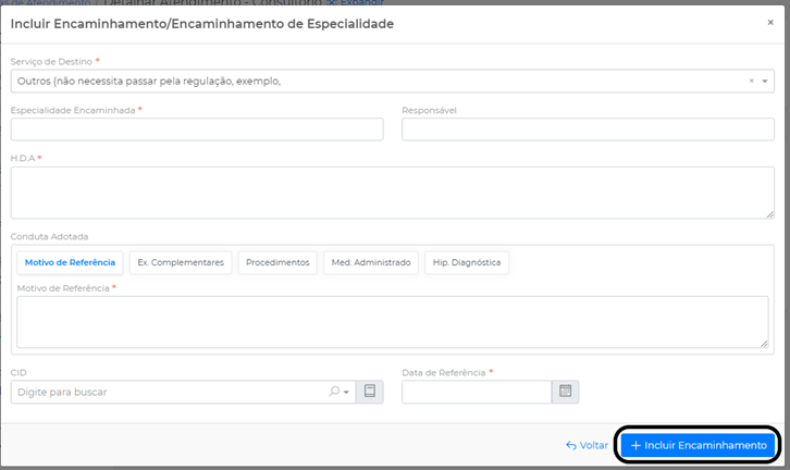 Preencha os campos Especialidade Encaminhada, HDA, Motivo da Referência, Exames Complementares, Procedimento, Med. Administrado, Hipótese Diagnóstica, Data da Referência e clique em Incluir Encaminhamento.