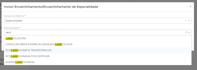 Encaminhamento/Encaminhamento Especialidade: onde serão solicitados os encaminhamentos para as especialidades da Regulação. Em Incluir Requisição clique em Especialidade e digite a especialidade desejada: