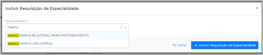 Solicitação de Mamografia: para as solicitações de Mamografia clique em Incluir Requisição de Especialidade e escolha a opção Mamografia: