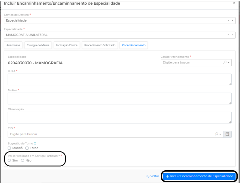 Caráter de Atendimento, Histórico da Doença Atual (H.D.A.), Motivo, CID, selecione se o exame vai ser realizado pelo particular ou não e clique em Incluir Requisição de Especialidade: