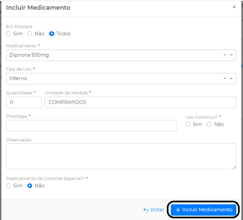 Em Medicamento, digite o nome do medicamento desejado, preencha os campos obrigatórios e clique em Incluir Medicamento: