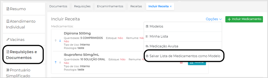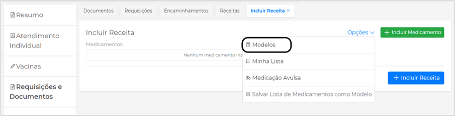 Ainda na tela de Incluir Receita, no menu Opções, são disponibilizados os Modelos de Receita, Minha Lista, Medicação Avulsa e Salvar Modelo: