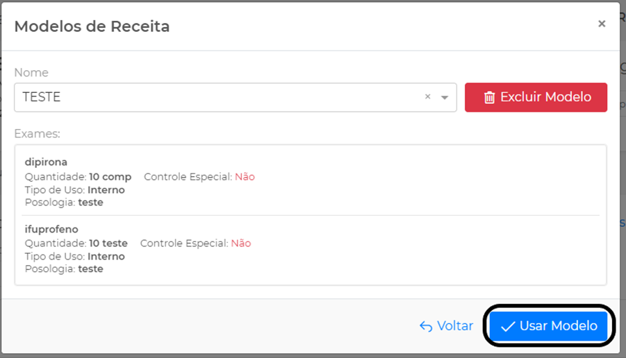 Permite que o profissional possa salvar os modelos de receitas que são utilizados com frequência, facilitando o preenchimento. Para acessar, clique em Opções, depois em Modelos na tela de inclusão de receita