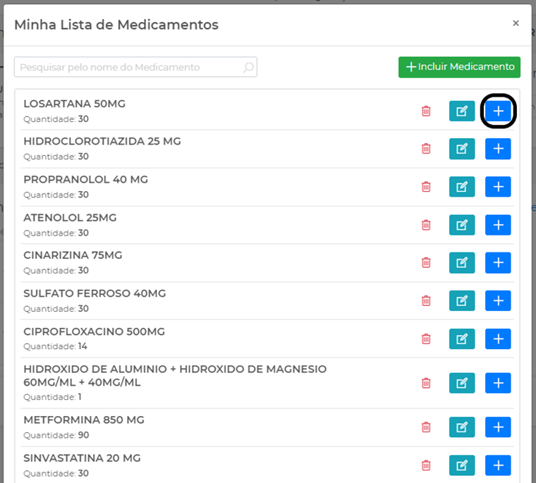 No medicamento desejado, clique no ícone azul com um sinal de +, preencha os campos e clique em Incluir Medicamento: