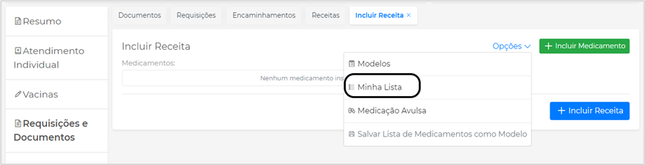 Permite ao profissional cadastrar medicamentos que não existam no sistema. Paca acessar, na tela de inclusão de receita, clique em Opções, depois em Minha Lista: