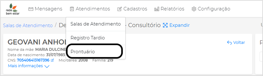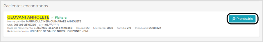Nos resultados da busca, localize o paciente desejado e clique em Prontuário: