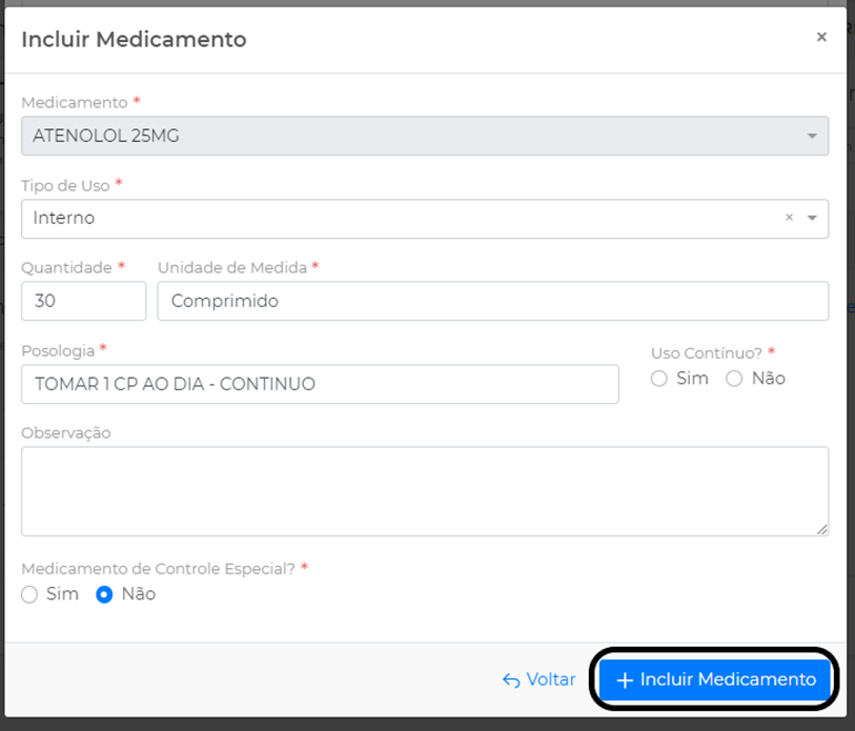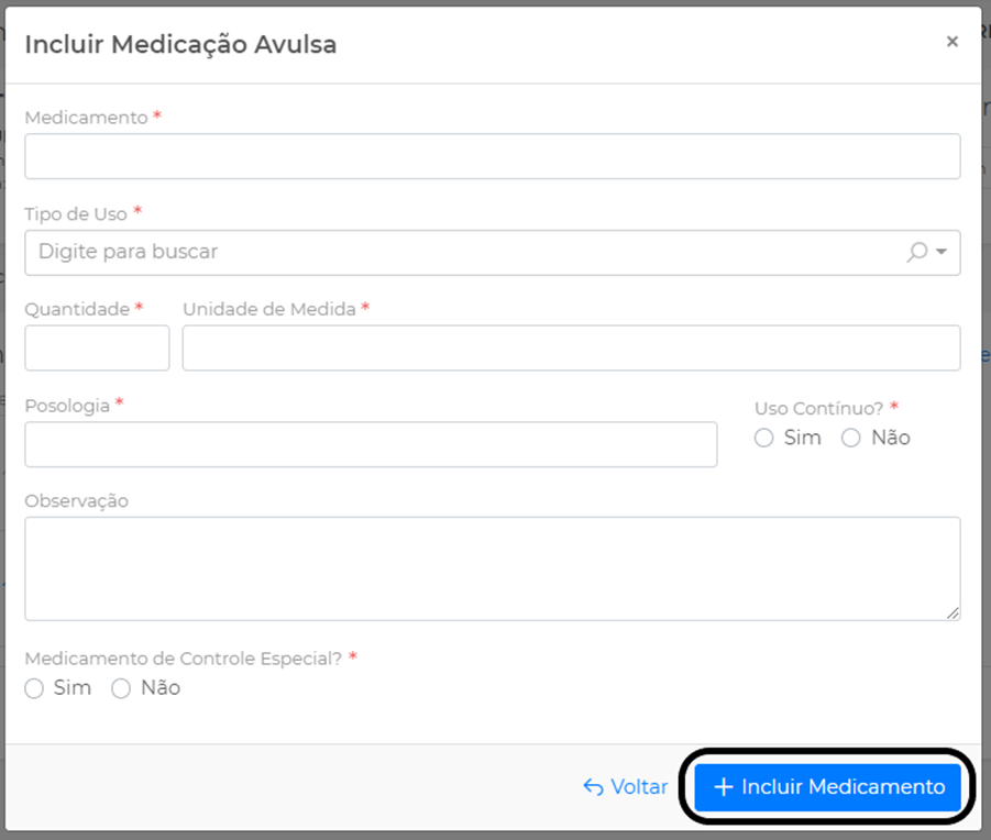 Descreva os dados sobre os medicamentos e clique em Incluir Medicamento: