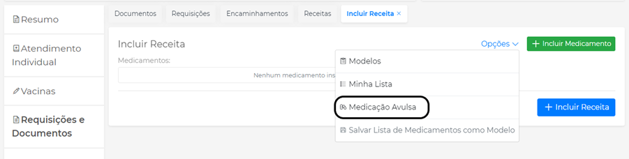 Permite ao profissional inserir no receituário uma medicação que não esteja nem no cadastro de medicamentos, nem na Minha Lista. Para incluir, clique no menu Opções, depois em Medicação Avulsa na tela de Incluir Receita:
