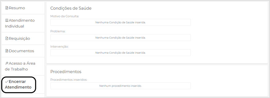 No encerramento temos todo o resumo do atendimento em Condições de Saúde e Procedimentos.